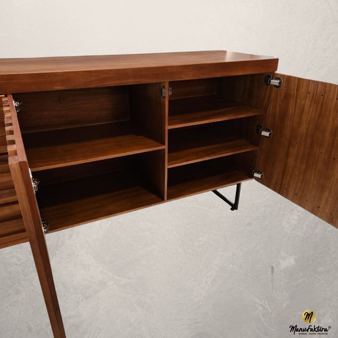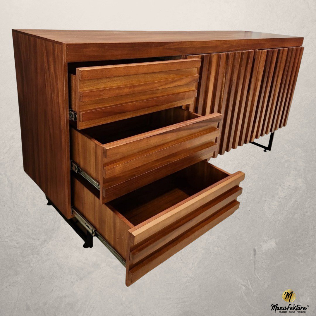 Fabricada en chapa de parota con detalles en parota sólida, esta bufetera con 2 puertas y 3 cajones ofrece el equilibrio perfecto entre diseño, espacio y elegancia. Ideal para complementar tu comedor o sala con un toque cálido y moderno